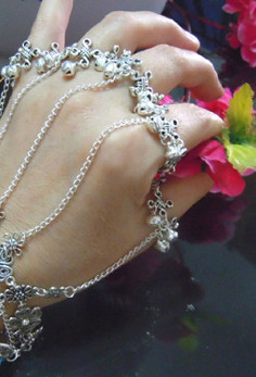 Elevate your accessory game with this exquisite vintage-style silver hand chain, featuring intricate filigree metalwork that elegantly connects your wrist to your fingers. Adorned with delicate white pearls and vibrant turquoise accents, this bohemian piece adds a touch of ethnic charm and sophistication to any outfit. Perfect for weddings, festivals, or boho-chic events, this traditional 'hathphool' inspired jewelry serves as a stunning statement piece for brides and fashion-forward women.