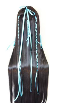 This sleek, long straight wig features a deep dark brown hue and precise blunt bangs, offering a polished look for various character portrayals. It is uniquely styled with light blue ribbon ties on the side locks that flow into dramatic, extra-long black streamers, evoking a traditional Asian aesthetic. Made from durable synthetic fibers, this wig is designed for comfort and ease of styling during long wear. It is the perfect accessory for cosplay enthusiasts, Halloween celebrations, or anyone looking to embody a fantasy princess or historical figure.
