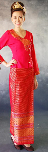 This elegant ensemble features a vibrant red blouse with a distinctive asymmetrical gold brocade placket and delicate pearl buttons. Paired with a matching red and gold striped silk sinh skirt, the outfit offers a luxurious drape and authentic traditional aesthetic. Perfect for Thai weddings, cultural festivals like Songkran, or formal gatherings, this attire beautifully embodies the grace and sophistication of Southeast Asian heritage.