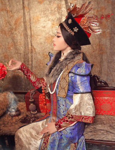 Embrace the elegance of the steppes with this exquisite traditional Mongolian costume, featuring a luxurious blue and gold brocade robe adorned with intricate embroidery and plush fur trim. The ensemble includes a stunning, tall headdress decorated with vibrant feathers and beads, perfectly capturing the regal aesthetic of ethnic minority heritage. Ideal for cultural performances, stage productions, or professional photography, this complete set allows women to authentically portray the rich history and beauty of Mongolian fashion.