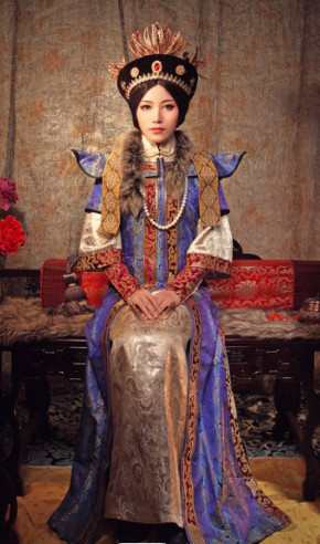Traditional Chinese Mongolian National Costume for Women Blue Silk Robe with Fur and Headdress