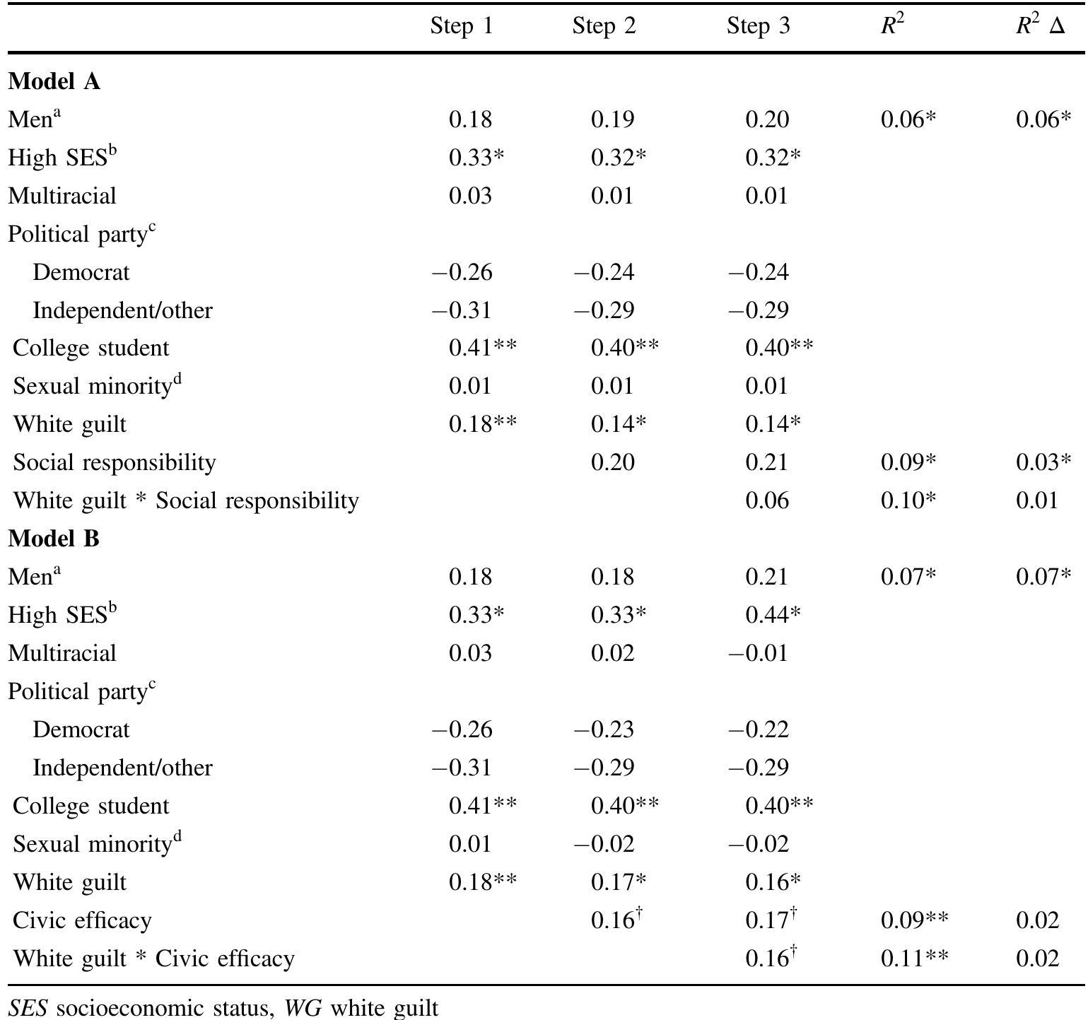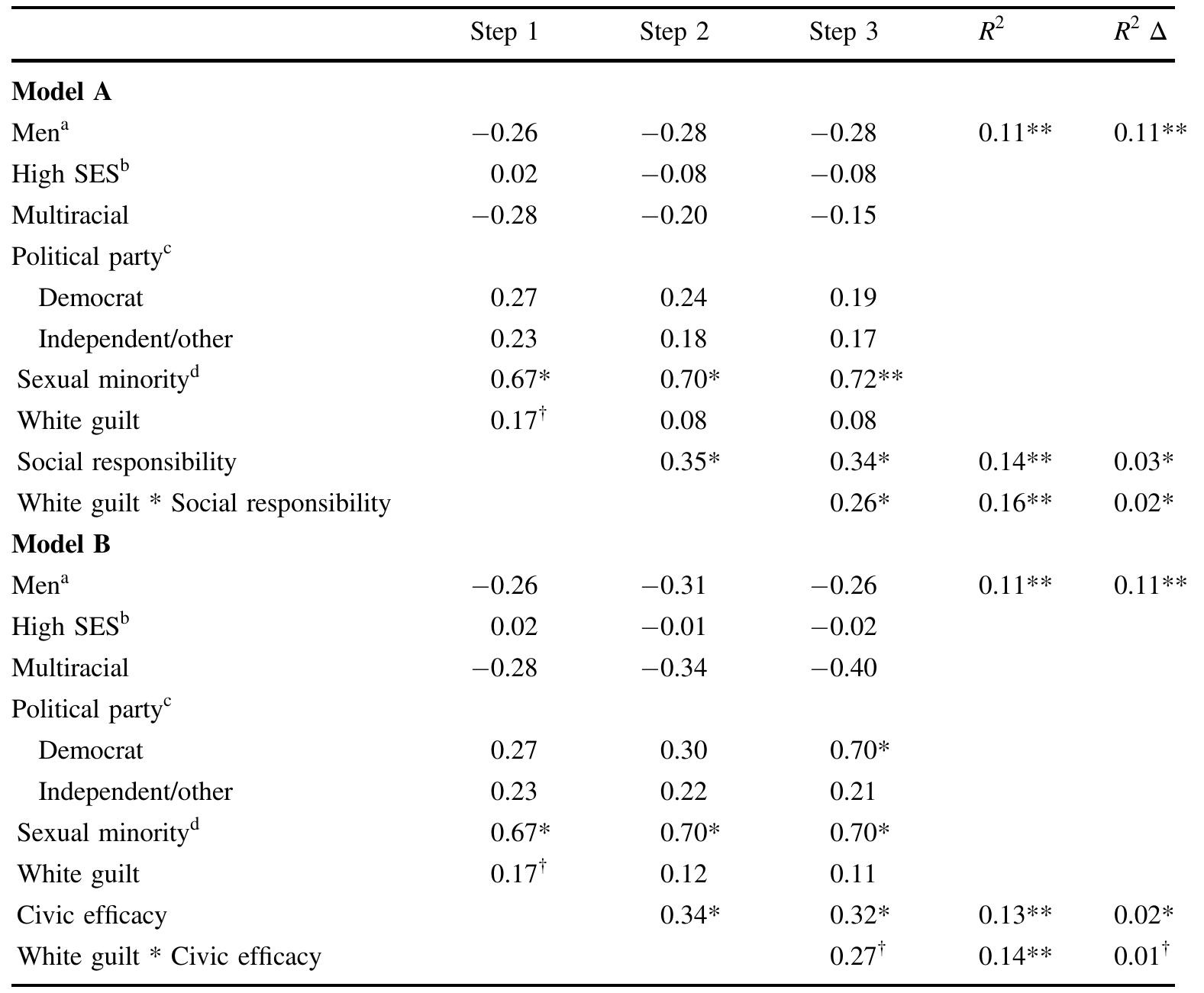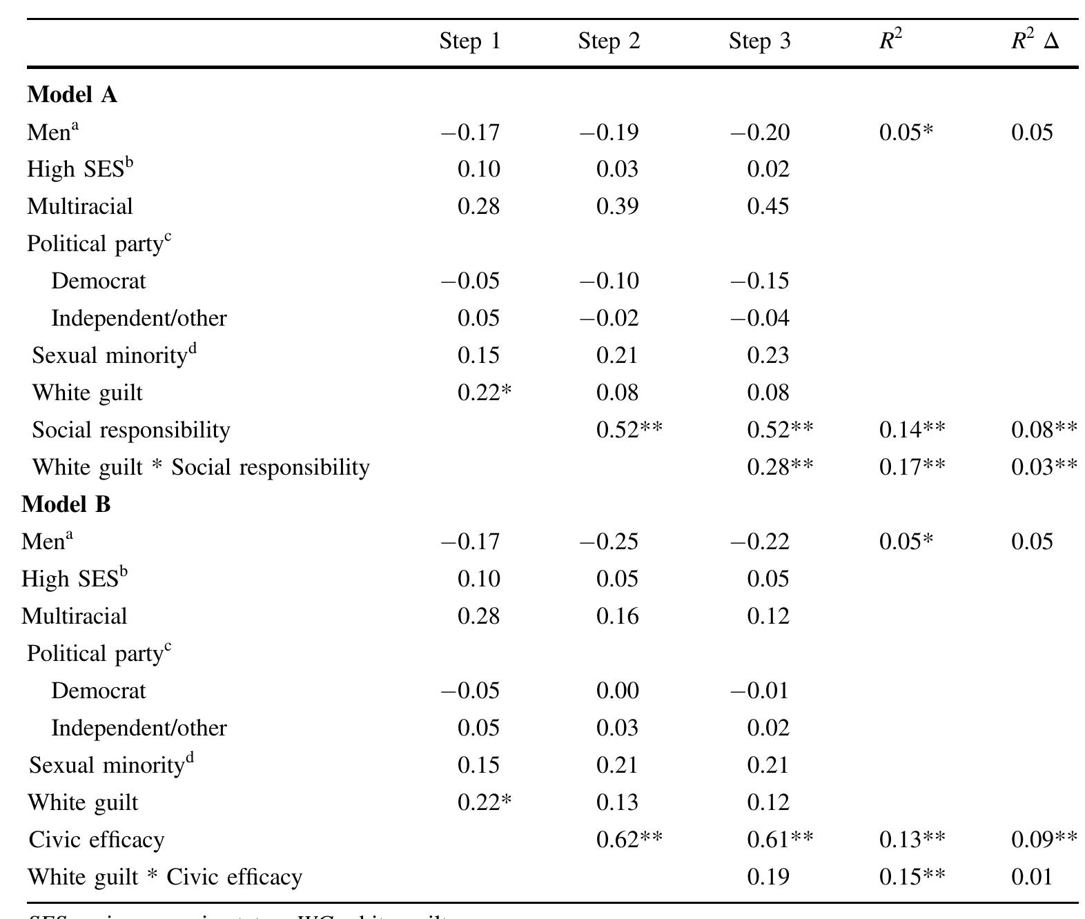 Limited research has investigated factors that shape White youth's civic action aimed at social c... more Limited research has investigated factors that shape White youth's civic action aimed at social change. Investigating the relation between Whiteness and civic action is an essential step toward identifying and cultivating environments that encourage White youth to use their racial privilege to combat inequality through civic engagement. To address this gap in the literature, across two distinct samples, this study investigates the role of White guilt in motivating civic action and the moderating role of civic beliefs. Participants included all young adults who self-identified as White from two online survey studies (Study 1, N = 219 college students, 71.9% Women, 28.1% Men, mean age = 19.6; Study 2, N = 185, 50% current college students, 54.6% Women, 45.4% Men, mean age = 23.9). In Study 1, White guilt related to more civic action. In the context of high social responsibility, White guilt related to more civic action; in the context of low social responsibility, White guilt corresponded with less civic action. In Study 2, White guilt also related to more civic action, and civic efficacy emerged as a potential moderator. Collectively, these results highlight the potential for White guilt to be turned into meaningful civic action, particularly when coupled with civic beliefs.