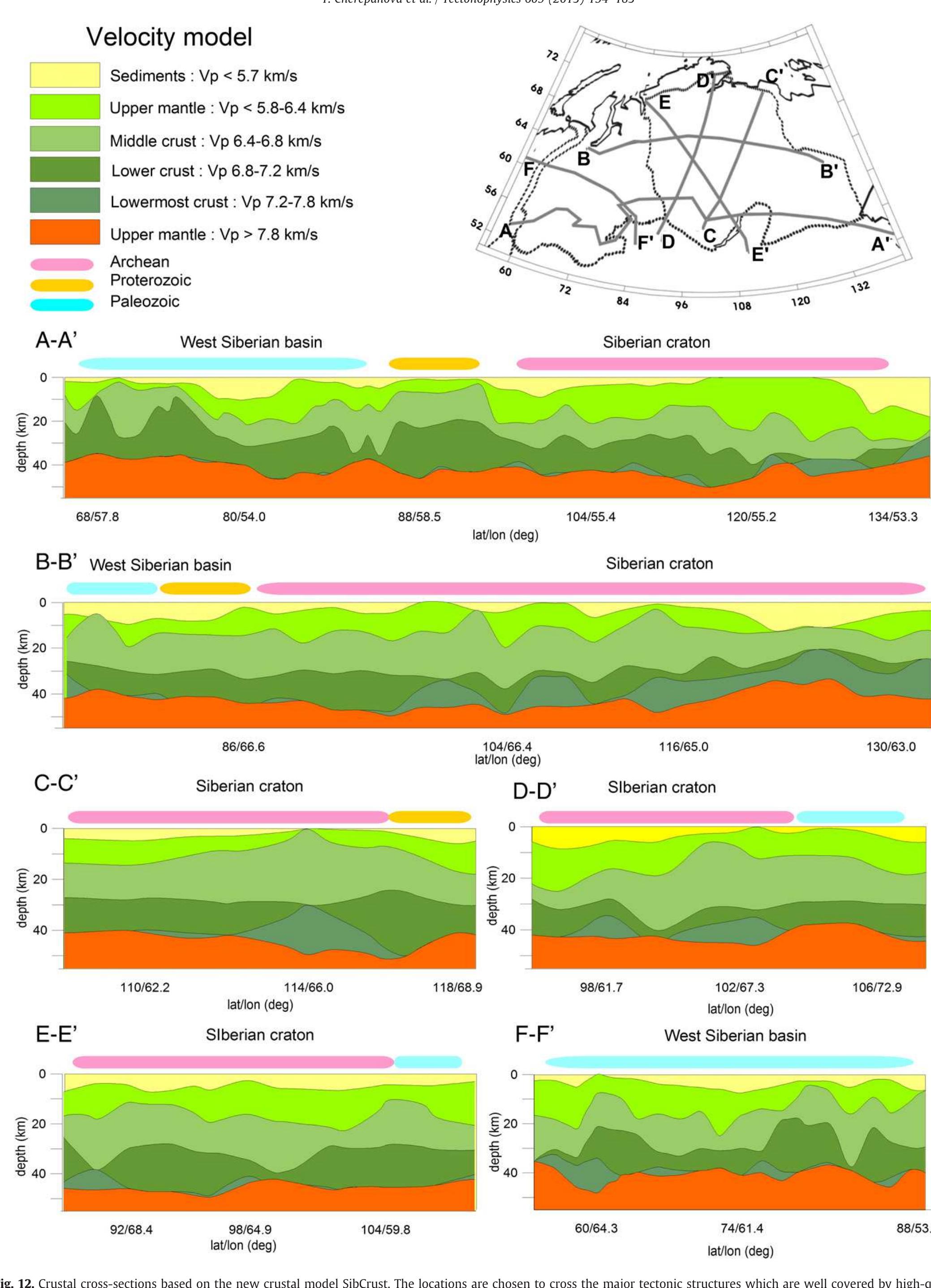 Siberian craton orogens, 35–38 km in extended cratonic crust, and 38–42 km in the West Siberian basin. Average crustal Vp ve-