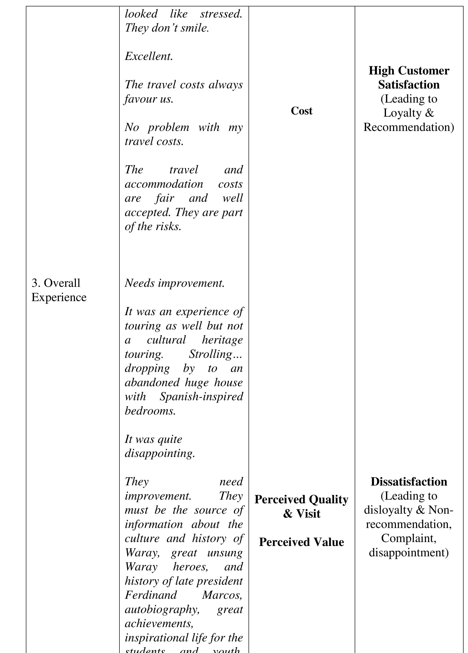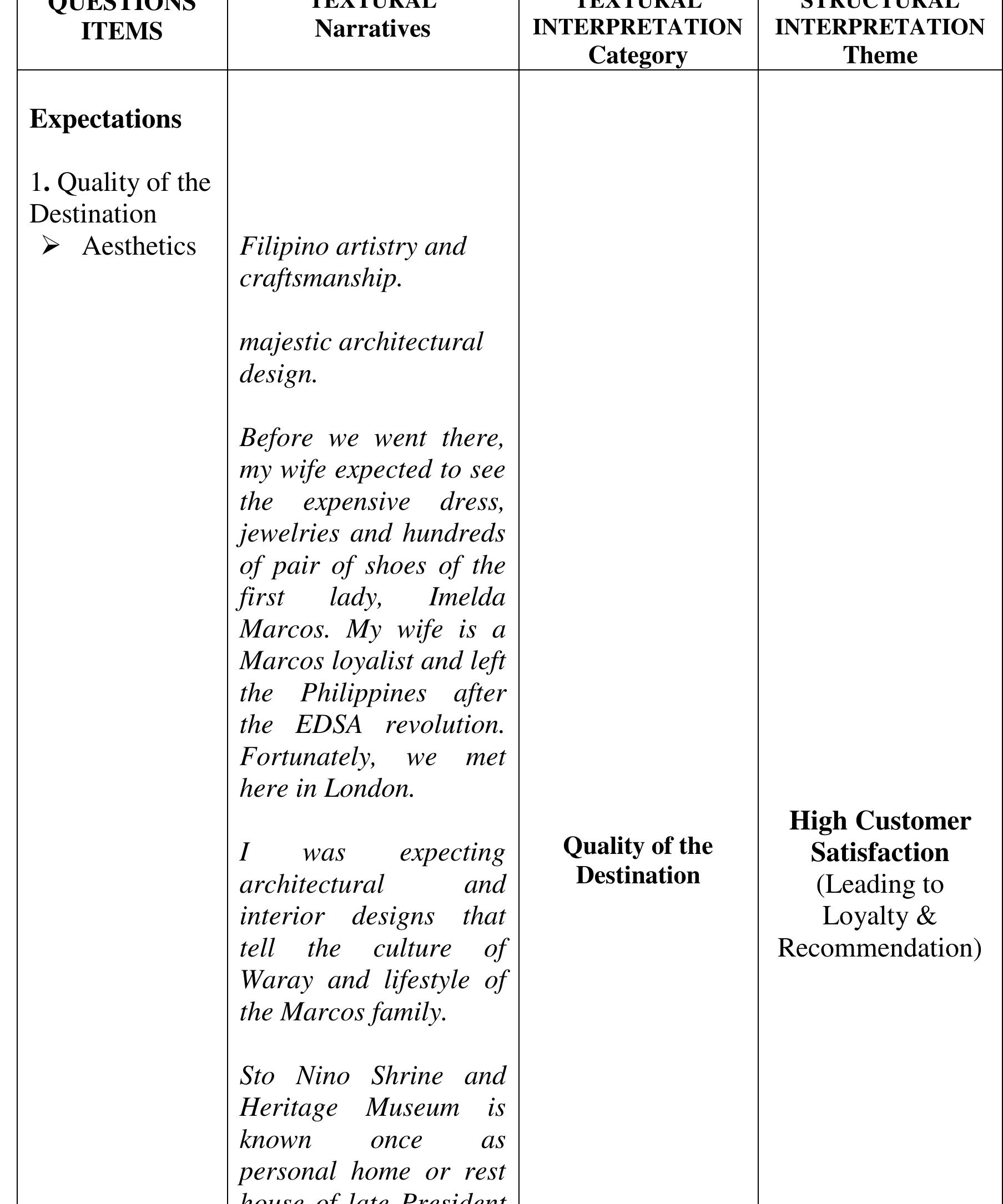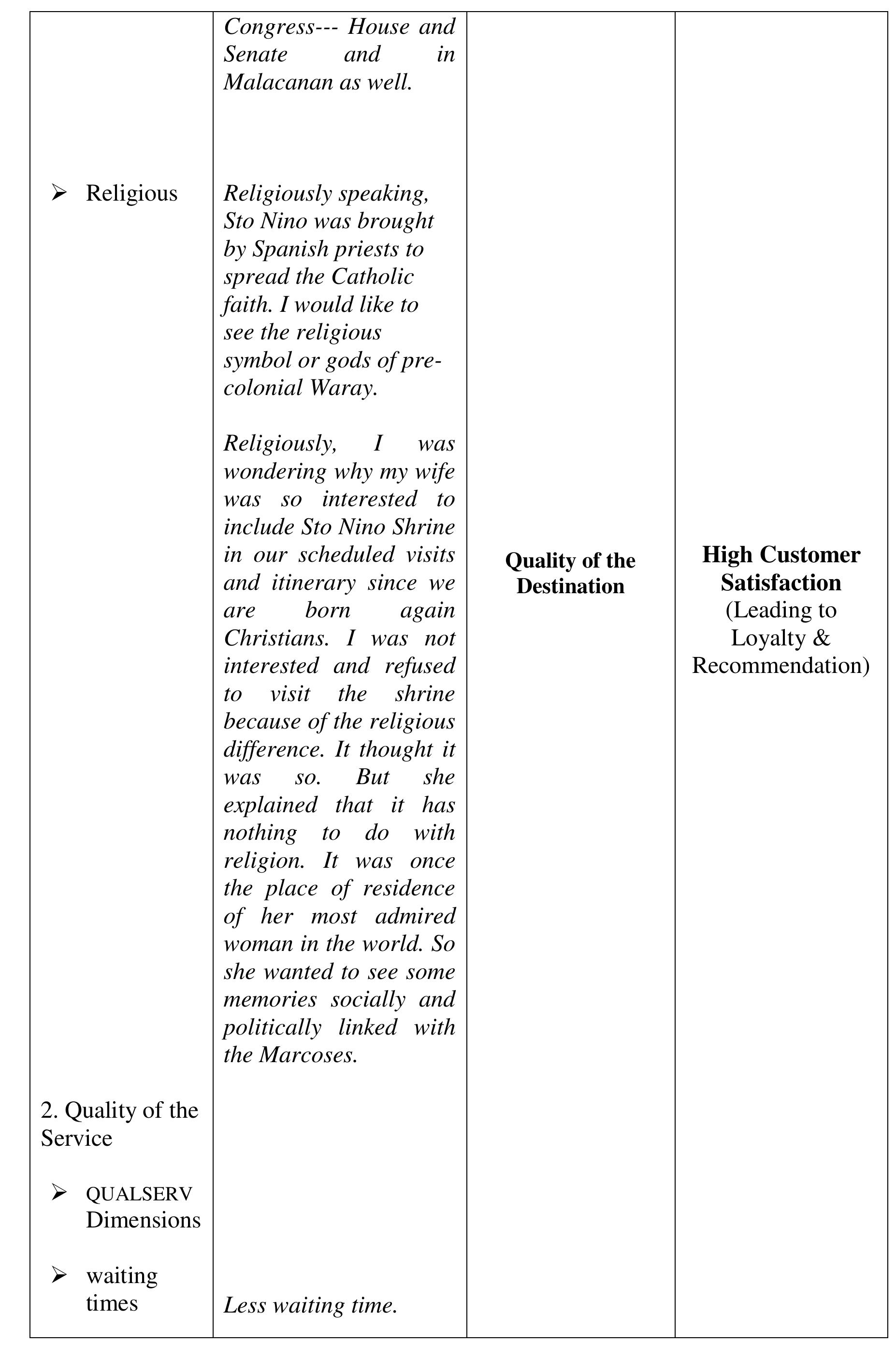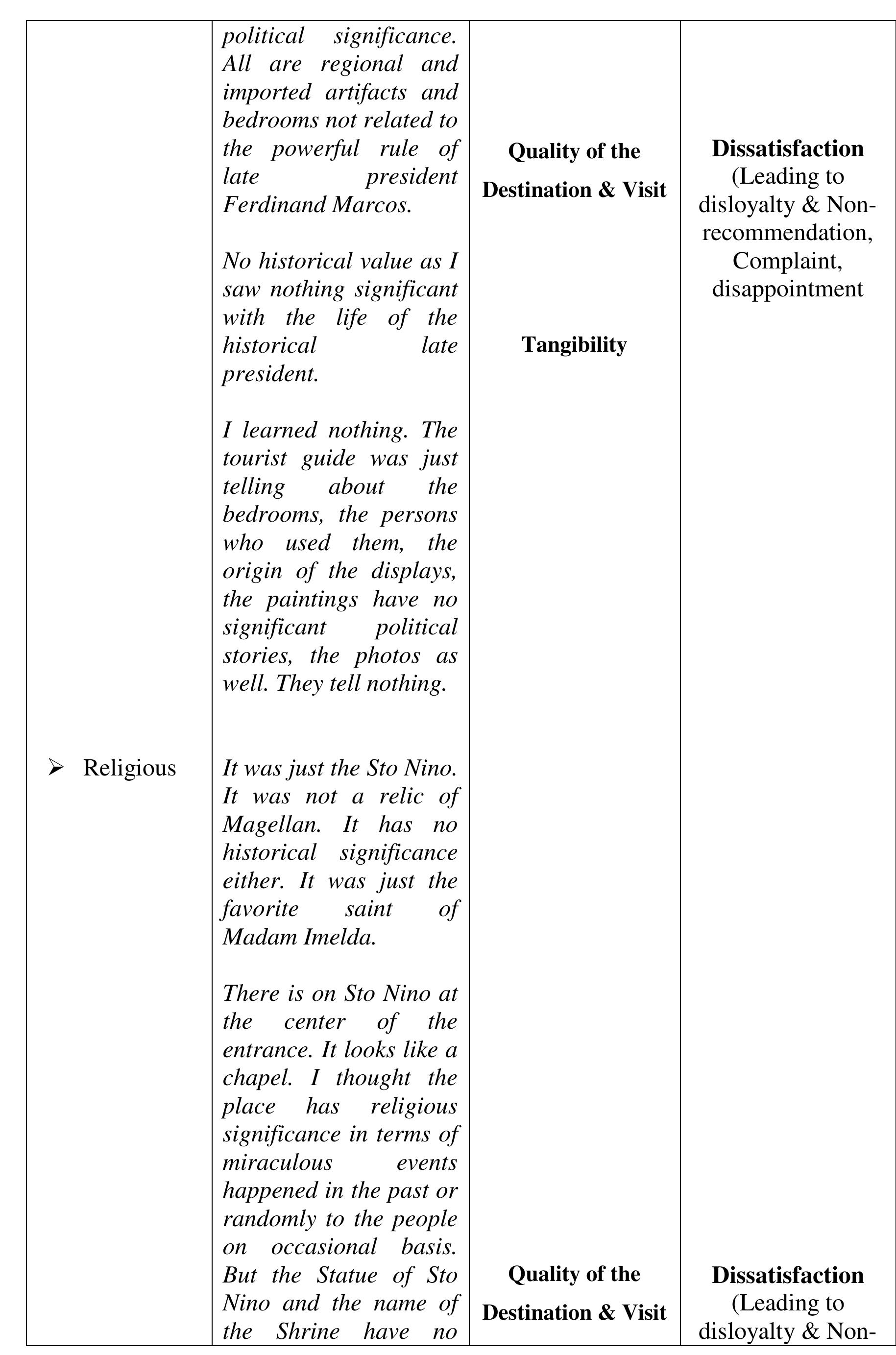The aim of the study was to determine the perceived quality of the destination, visit and service... more The aim of the study was to determine the perceived quality of the destination, visit and service, and perceived experience of the visitors of the Sto. Nino Shrine & Heritage Museum that affect the visitors' satisfaction, loyalty and word-of-mouth recommendations to their friends and relatives critical to the growing numbers of visitors annually. The investigation was done within the phenomenological-case study research design. The findings of the investigation suggest that the perceived experience and perceived quality of the destination, visit and service in comparison to expectations developed the negative feelings described as "Totally Unsatisfied." The perceived experience or performance of the destination and service of Sto Nino Shrine and Heritage Museum, failed to deliver the expectations. We compared the visitors' expectations as performance standards; and the money spent (perceived value), with the perceived experience and perceived quality of the actual performance of the destination and service to describe the gap between the expected and perceived experienced quality. The structural description of visitors' feelings or emotional satisfaction, affected or developed by the expectation-performance gap, is "Dissatisfied" feelings which lead to disloyalty and non-recommendation of the destination and service. The feelings or satisfaction are affected by the perceived quality and experience. Each component of the perceived value is described as "Dissatisfied" except the Empathy-"waiting time", Price and Cost-components of perceived value described as "Satisfactory" which suggests that the perceived value is not affected by perceived quality, perceived experience and feelings or satisfaction about expectation-experience gap. Several literature and evidences support the findings of the study. In conclusion, the decreasing number of tourists visiting the Sto Nino Shrine and Heritage Museum is traced from the feelings or satisfaction of the visitors, described as "Totally Unsatisfied," feelings developed from perceived experience and perceived quality of the destination, visit and service in textural form. Further concluded, the perceived value is not a factor to-neither can be affected by perceived quality of destination, visit and service, perceived experience and visitors' feelings or satisfaction and loyalty.