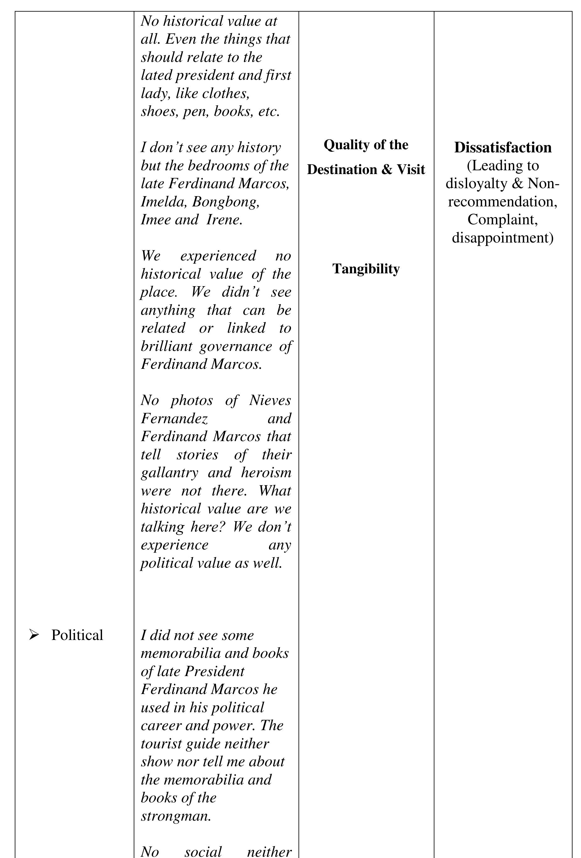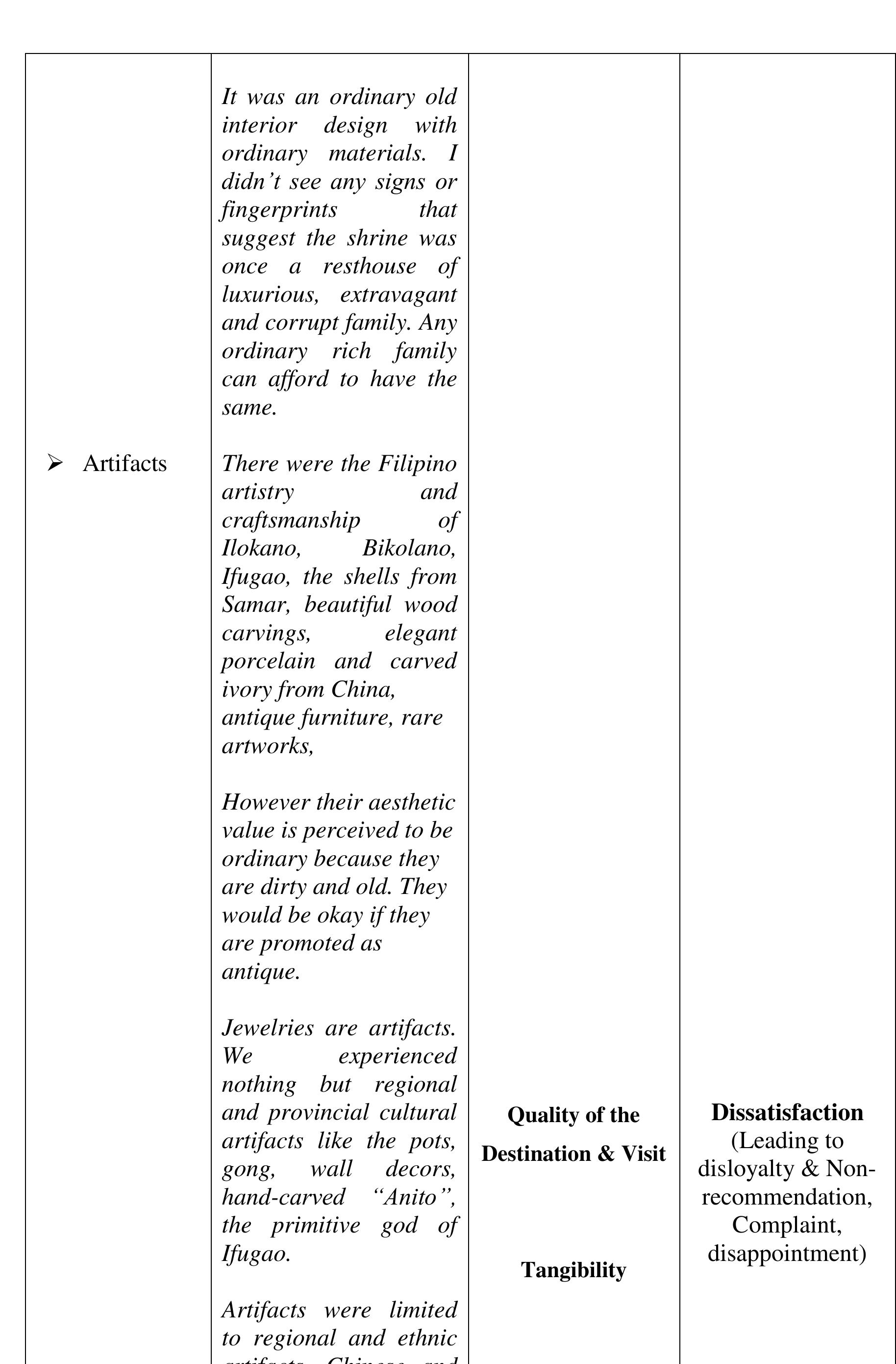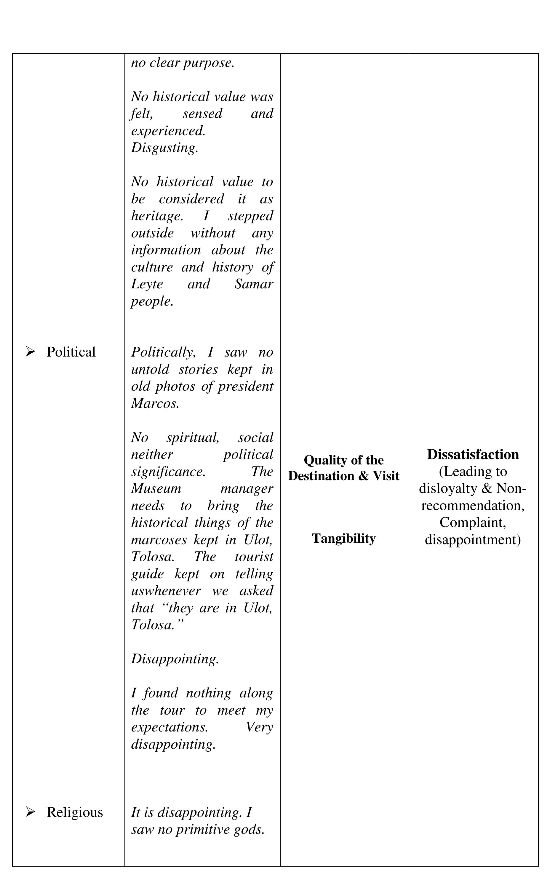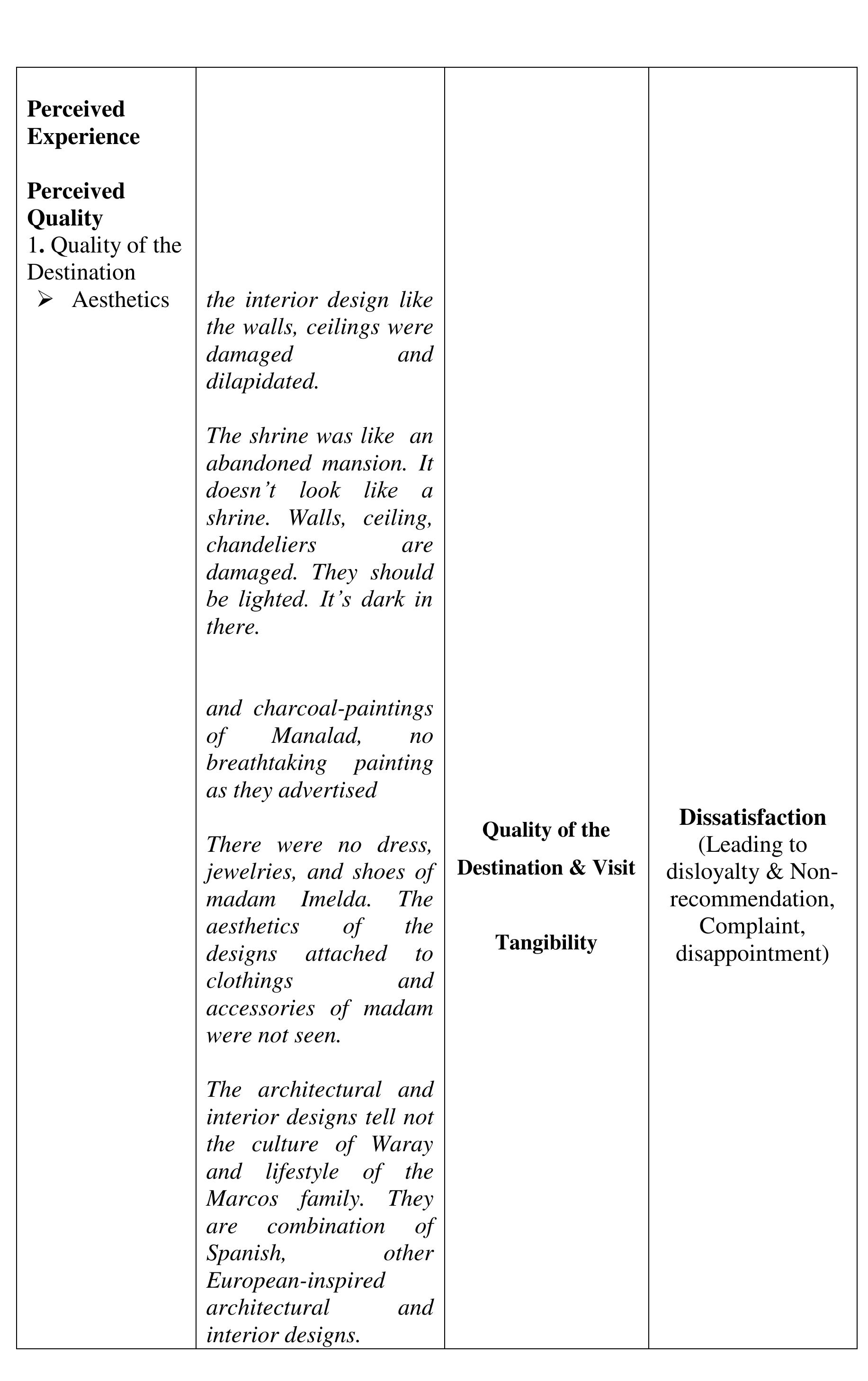 The aim of the study was to determine the perceived quality of the destination, visit and service... more The aim of the study was to determine the perceived quality of the destination, visit and service, and perceived experience of the visitors of the Sto. Nino Shrine & Heritage Museum that affect the visitors' satisfaction, loyalty and word-of-mouth recommendations to their friends and relatives critical to the growing numbers of visitors annually. The investigation was done within the phenomenological-case study research design. The findings of the investigation suggest that the perceived experience and perceived quality of the destination, visit and service in comparison to expectations developed the negative feelings described as "Totally Unsatisfied." The perceived experience or performance of the destination and service of Sto Nino Shrine and Heritage Museum, failed to deliver the expectations. We compared the visitors' expectations as performance standards; and the money spent (perceived value), with the perceived experience and perceived quality of the actual performance of the destination and service to describe the gap between the expected and perceived experienced quality. The structural description of visitors' feelings or emotional satisfaction, affected or developed by the expectation-performance gap, is "Dissatisfied" feelings which lead to disloyalty and non-recommendation of the destination and service. The feelings or satisfaction are affected by the perceived quality and experience. Each component of the perceived value is described as "Dissatisfied" except the Empathy-"waiting time", Price and Cost-components of perceived value described as "Satisfactory" which suggests that the perceived value is not affected by perceived quality, perceived experience and feelings or satisfaction about expectation-experience gap. Several literature and evidences support the findings of the study. In conclusion, the decreasing number of tourists visiting the Sto Nino Shrine and Heritage Museum is traced from the feelings or satisfaction of the visitors, described as "Totally Unsatisfied," feelings developed from perceived experience and perceived quality of the destination, visit and service in textural form. Further concluded, the perceived value is not a factor to-neither can be affected by perceived quality of destination, visit and service, perceived experience and visitors' feelings or satisfaction and loyalty.