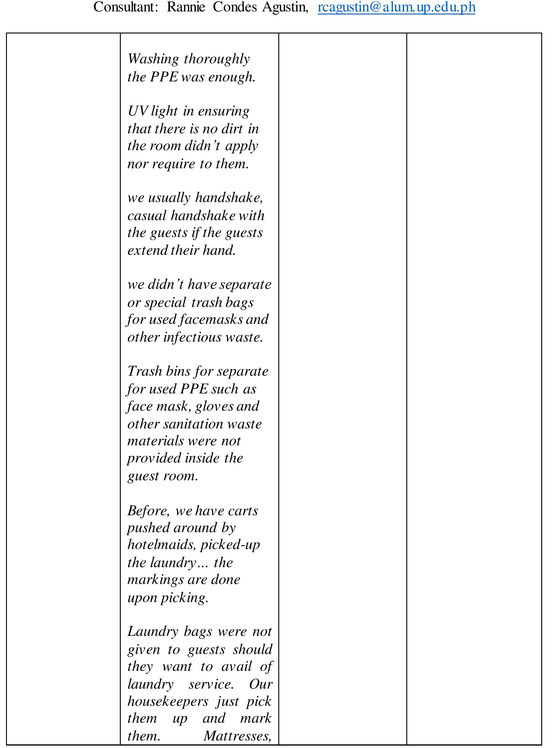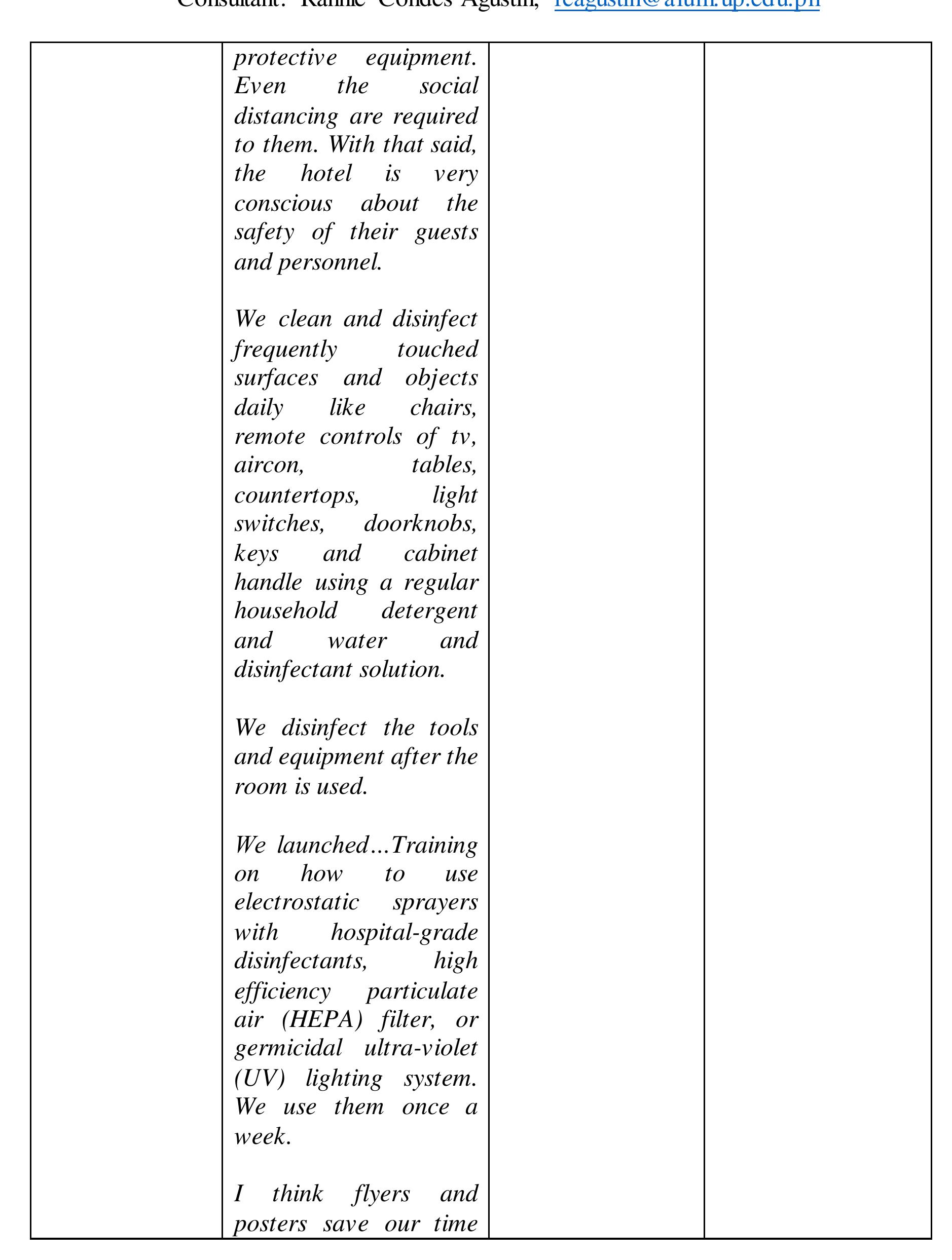 This study enquired into the hotel industry's housekeeping standards that conform to the more str... more This study enquired into the hotel industry's housekeeping standards that conform to the more stringent and experimental health protocols other than the recommendations from authorities.