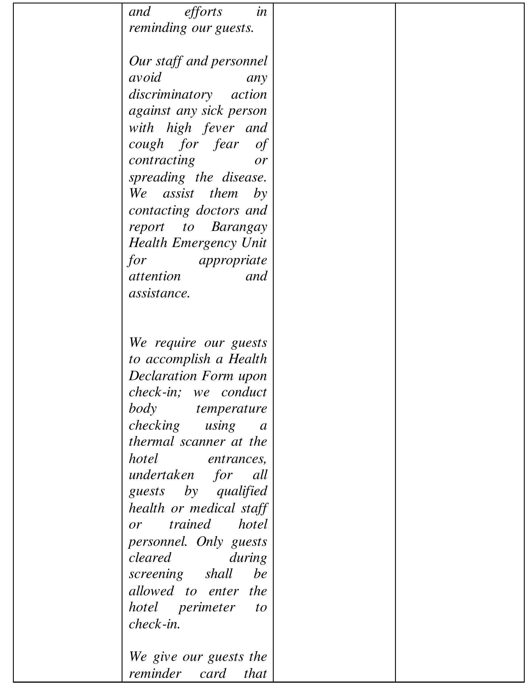 Factors include the continuous improvement policy (QUALSERVE, TQM) Theory of Planned Behavior (TPB), Health Belief Model (HBM), and legal framework of DOH Department Memorandum No. 2020-0157 and 0157-A and DOT Memorandum Circular No. 2020-002. Factors mentioned are expressed by the informants to have had great impact in their respective operations including the guests’ trust and confidence, guests’ and employees safety, minimization of epidemic or disease outbreak risks, increase in number of guests, revenue increases, and positive huge ROI.