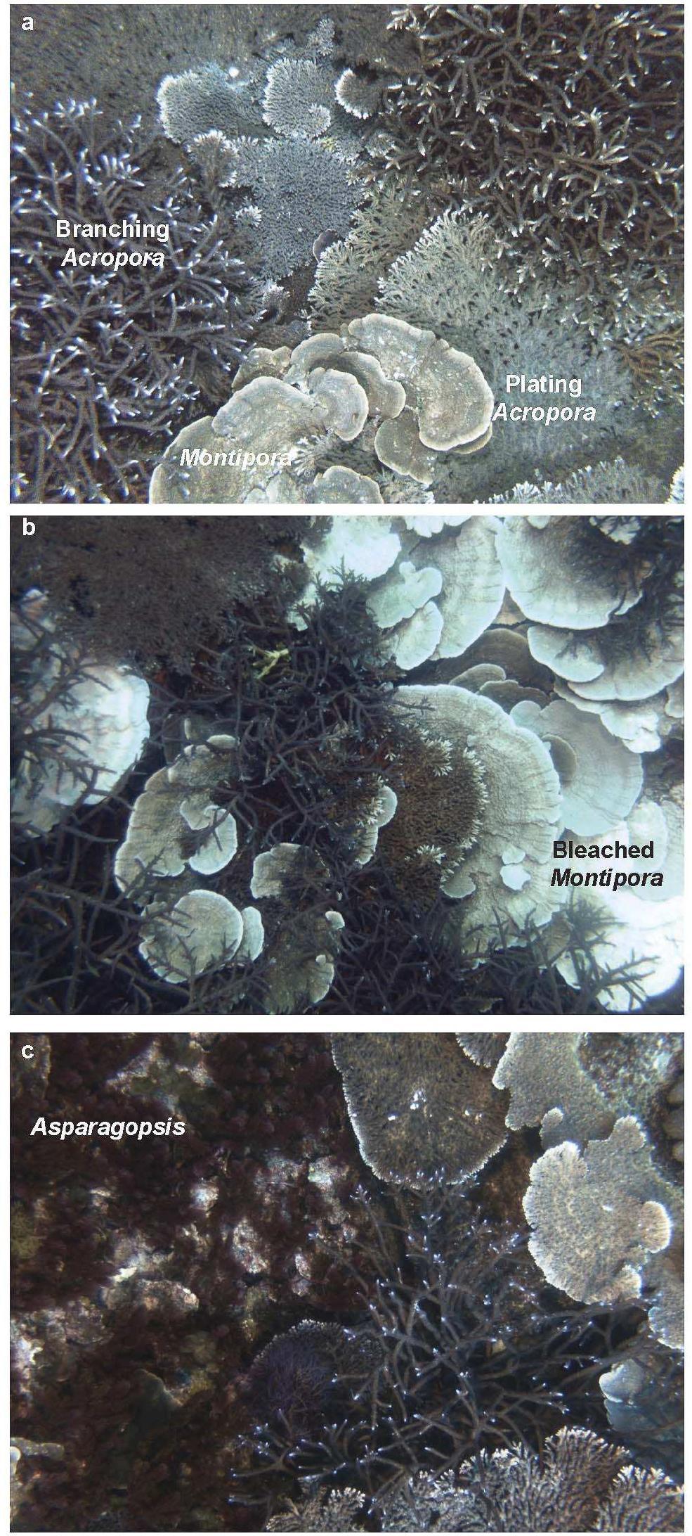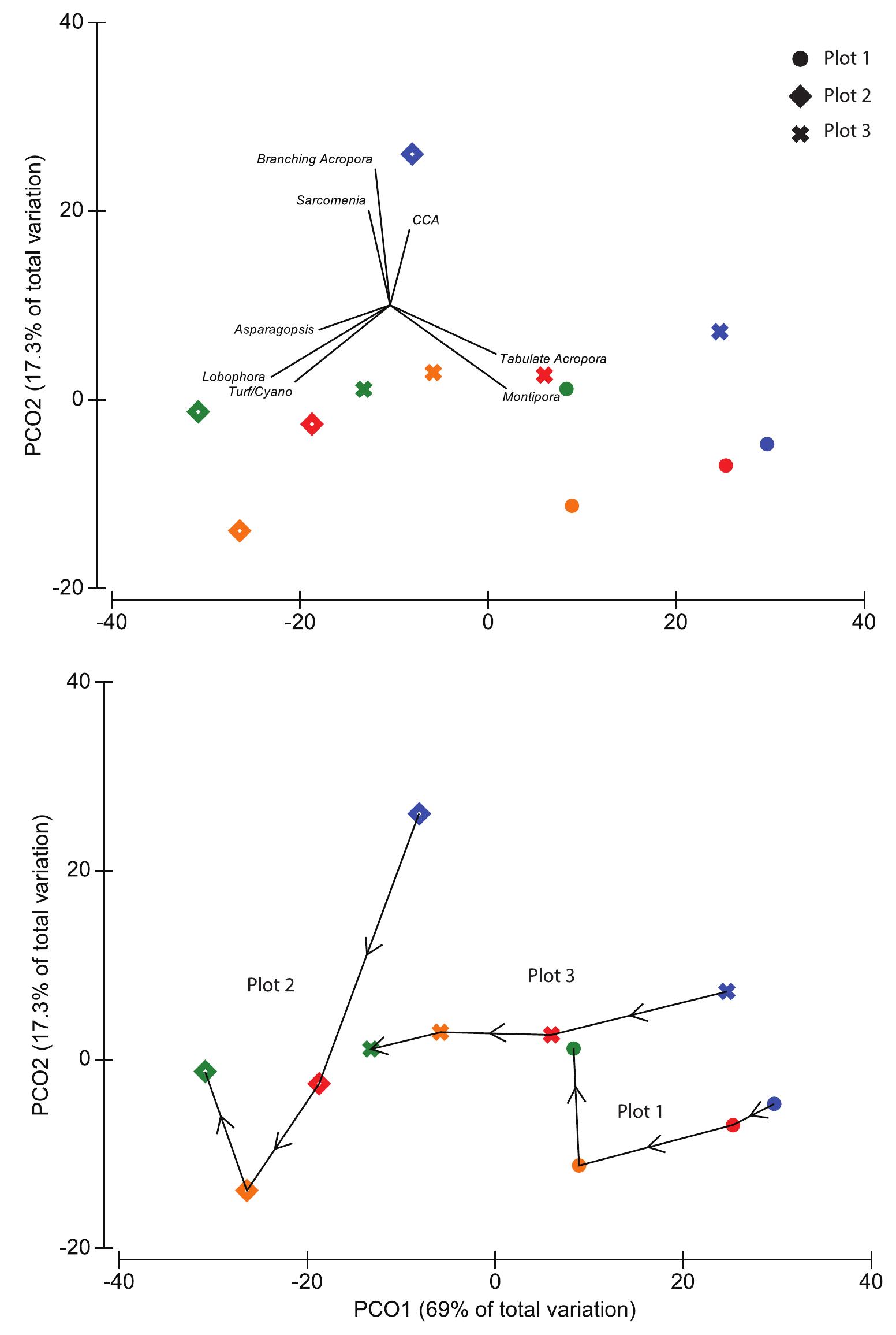High-latitude reefs support unique ecological communities occurring at the biogeographic boundari... more High-latitude reefs support unique ecological communities occurring at the biogeographic boundaries between tropical and temperate marine ecosystems. Due to their lower ambient temperatures, they are regarded as potential refugia for tropical species shifting poleward due to rising sea temperatures. However, acute warming events can cause rapid shifts in the composition of high-latitude reef communities, including range contractions of temperate macroalgae and bleachinginduced mortality in corals. While bleaching has been reported on numerous highlatitude reefs, post-bleaching trajectories of benthic communities are poorly described. Consequently, the longer-term effects of thermal anomalies on highlatitude reefs are difficult to predict. Here, we use an autonomous underwater vehicle to conduct repeated surveys of three 625 m 2 plots on a coral-dominated high-latitude reef in the Houtman Abrolhos Islands, Western Australia, over a fouryear period spanning a large-magnitude thermal anomaly. Quantification of benthic communities revealed high coral cover (.70%, comprising three main morphospecies) prior to the bleaching event. Plating Montipora was most susceptible to bleaching, but in the plot where it was most abundant, coral cover did not change significantly because of post-bleaching increases in branching OPEN ACCESS Citation: Bridge TCL, Ferrari R, Bryson M, Hovey R, Figueira WF, et al. (2014) Variable Responses of