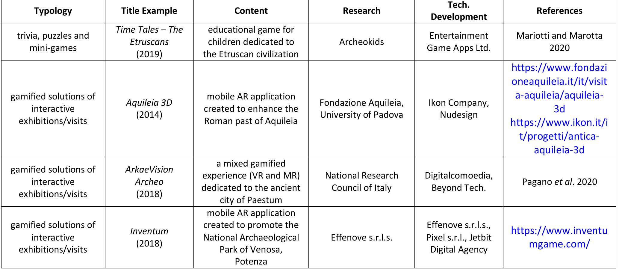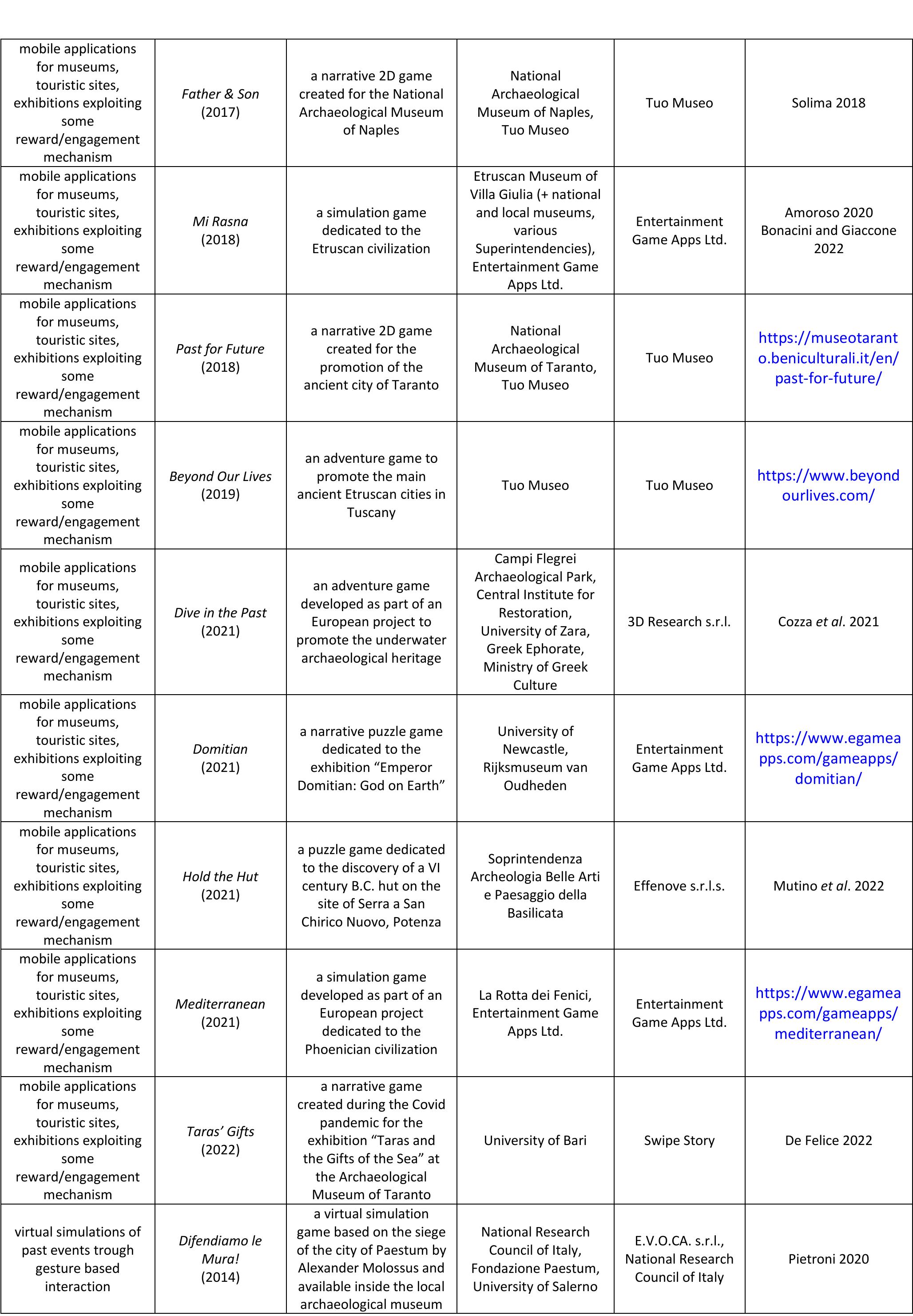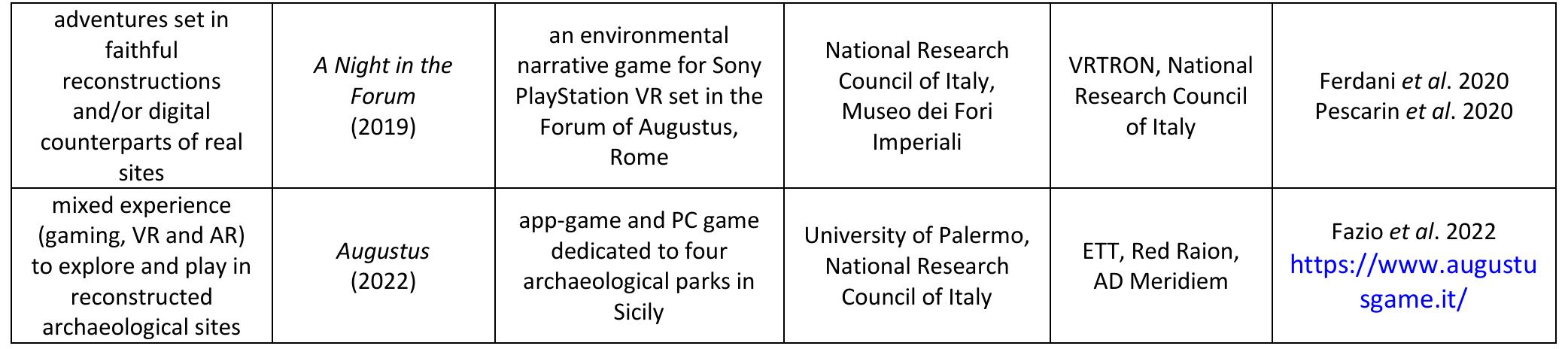 Video games are now recognised as a valuable tool for disseminating and enhancing cultural herita... more Video games are now recognised as a valuable tool for disseminating and enhancing cultural heritage. In Italy, the recent institutionalisation of Public Archaeology programs and incentives for digital innovation has resulted in a proliferation of video games for archaeological heritage. However, critical evaluation of these projects is still needed.