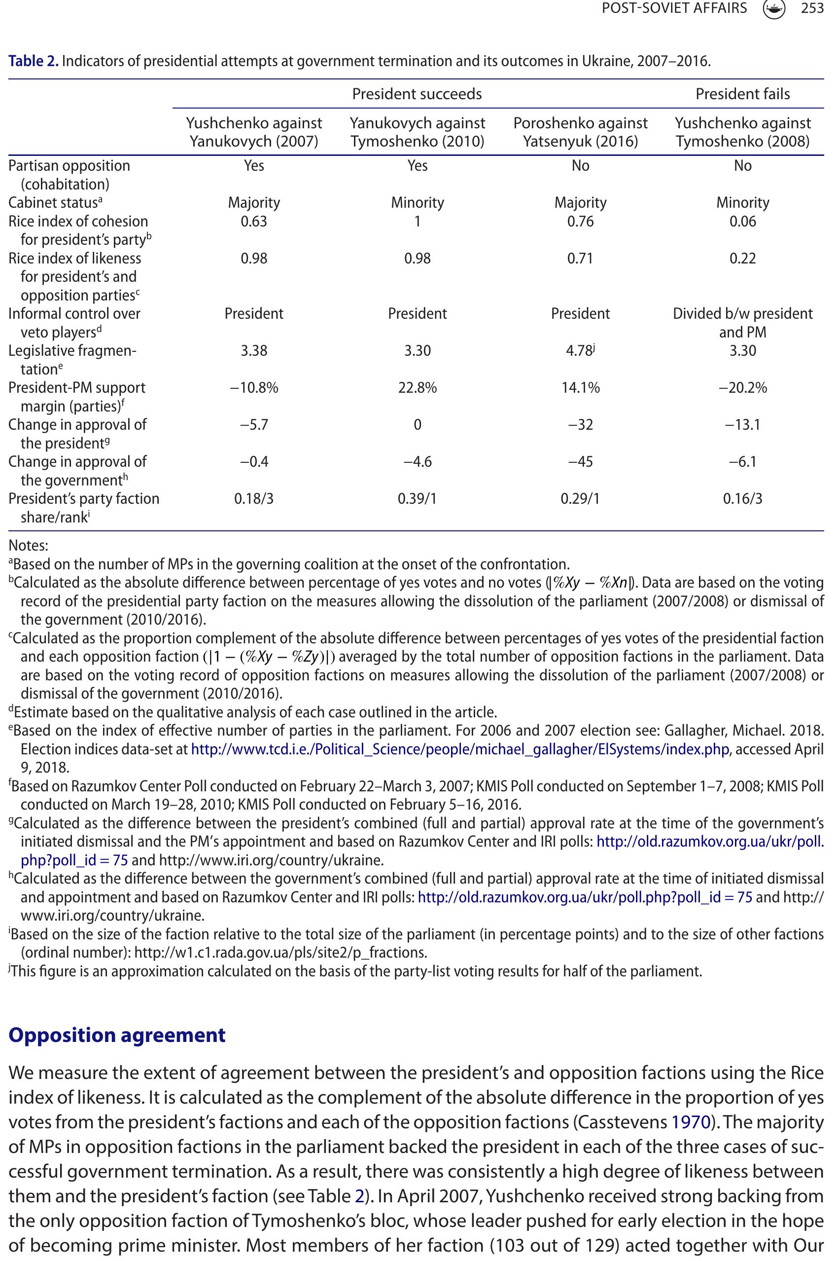The limits on presidential authority in premier-presidential regimes permit legislatures to wield... more The limits on presidential authority in premier-presidential regimes permit legislatures to wield preeminent influence over government formation and termination. This article shows that even without formal powers to dismiss the prime minister, the president may play a decisive role in government replacement. The article compares three successful and one failed attempt by the president to unseat the prime minister in Ukraine under a premier-presidential system. Based on a review of the significance of 10 variables accounting for presidential activism, it finds that the president’s informal control over institutional veto players as well as the unity of his party faction and cooperation of opposition groups were necessary for the success of attempted cabinet turnover.