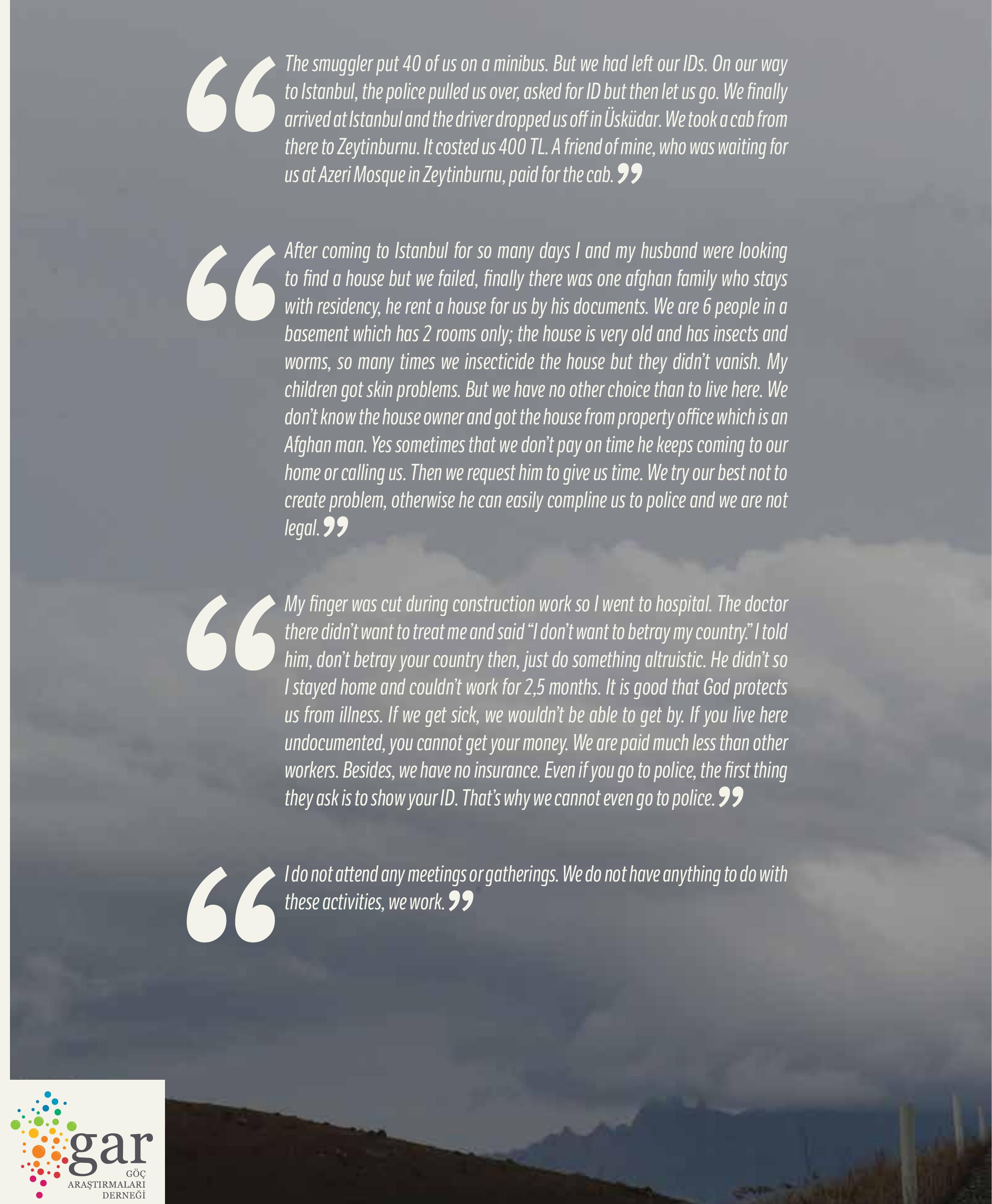 The report examines various forms of precarious conditions of Afghan population that constantly p... more The report examines various forms of precarious conditions of Afghan population that constantly proliferates both during their dangerous journeys as well as lives in Istanbul. While they represent the longest-displaced and dispossessed population in the world, Afghans have not yet received the attention they deserve from the international community. By highlighting a wider international infrastructure reproducing the precarity of Afghan population, this report turns the spotlight on the city of Istanbul and analyzes the circumstances in which Afghans work under extremely cruel conditions, live a totally isolated and invisible life without legal status and are completely abandoned by the international community and civil society. The report firstly reanimates all the steps of Afghans’ journeys from Afghanistan on the way to Istanbul by portraying and visualizing their treacherous routes. Then, the reproduction of various levels of precarity in the city of Istanbul is scrutinized within the contexts of their bodily and ascetic labor force, invisible mobility, fear of deportation and abandonment by the regimes of international protection. The report is based on in-depth interviews conducted with Afghans in the districts of Zeytinburnu, Esenyurt, Tuzla and Beykoz.