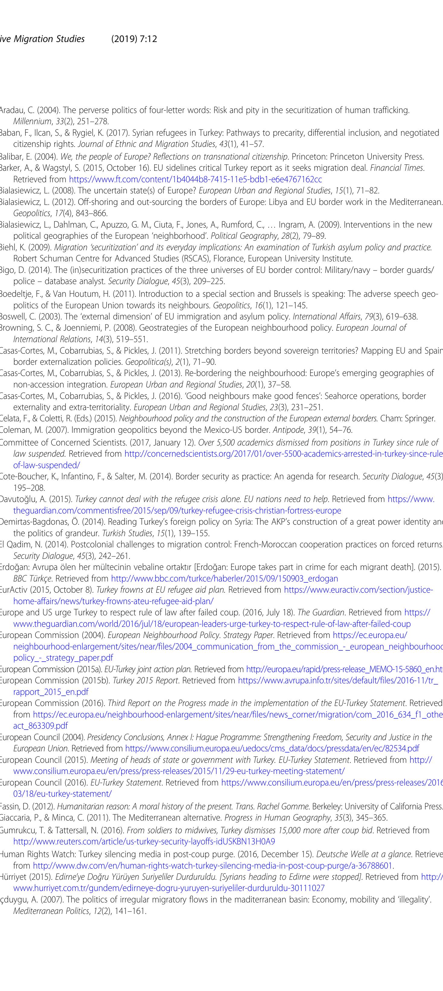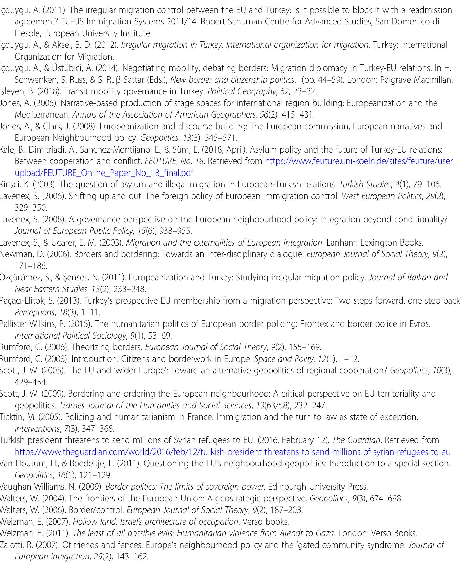 This article seeks to "decolonize" the externalization project of European borders by focusing on... more This article seeks to "decolonize" the externalization project of European borders by focusing on the subjectivity of Turkey as being a long-standing candidate country, seeking to be a "regional power" in the Middle East and increasingly moving into undemocratic rule. The study suggests that externalization project of European borders does not only move outwards from the European center, and then straightforwardly get implemented by the passive "others". The case of Turkey epitomizes that the "others" are geopolitical subjects with their counter-discourses and strategies as well as their co-constitutive roles in shaping the very framework of the process. The study adopts an implementation perspective with the aim of providing nuanced local details about how Turkish border guards act, interpret, internalize or challenge the border externalization policies.