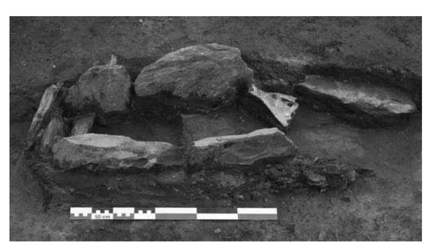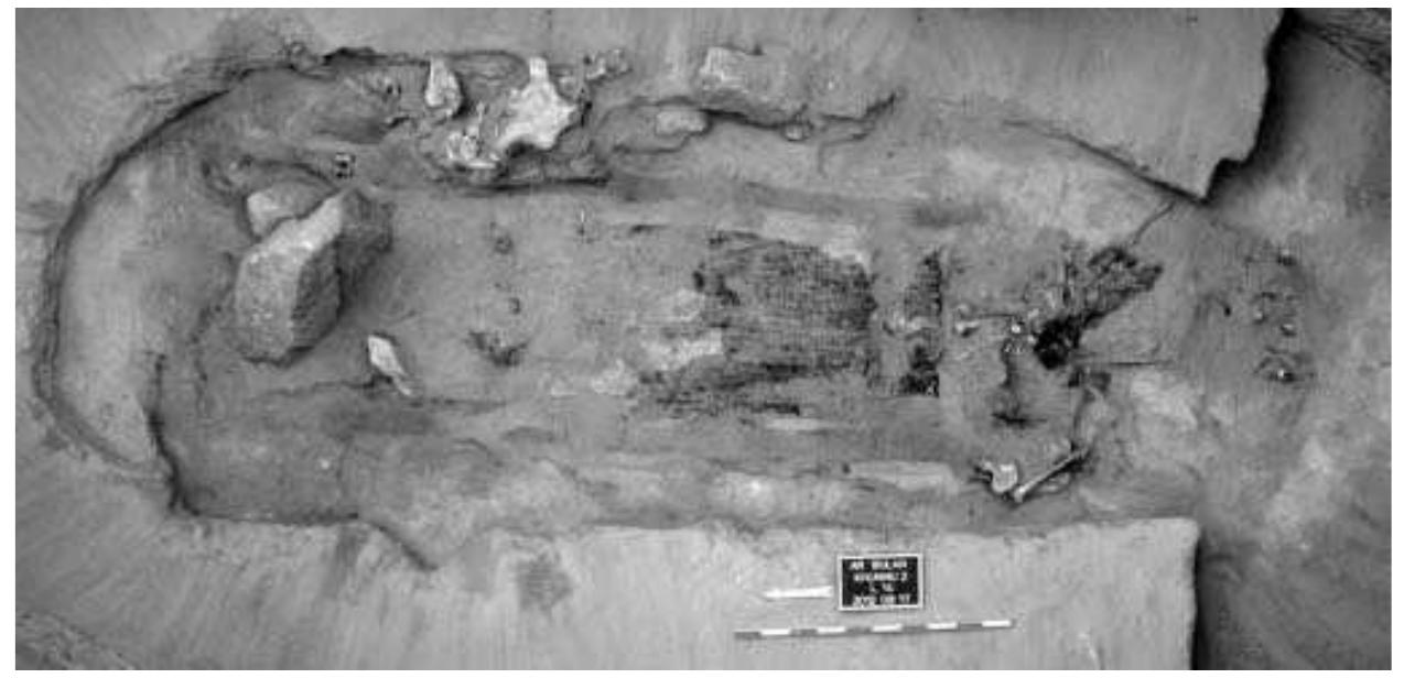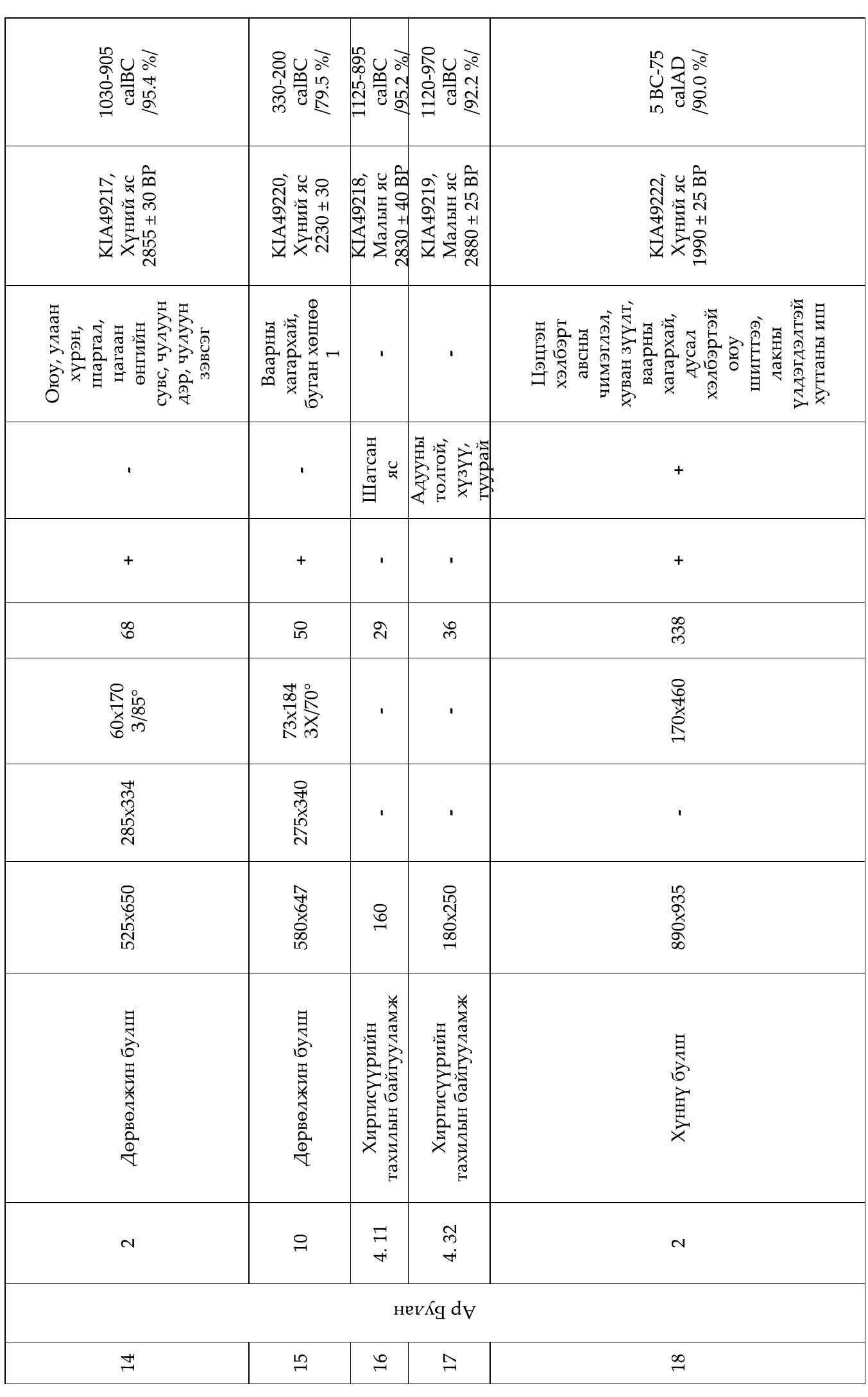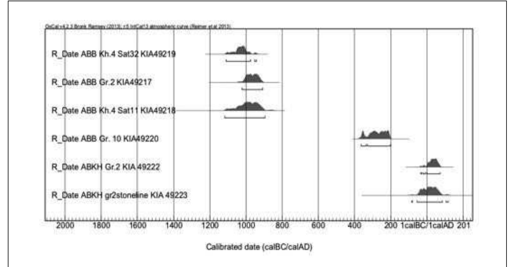 The density and variety of structures in this cemetery is not only exceptional for the whole upper and middle Orkhon valley, but also for other regions as well. So far a total of twelve structures of different shape, size, and construction have been investigated in Maikhan Tolgoi (Fig. 1; structures 3, 10, satellite 3 and 9 of khirgisuur 12, 13, 16, 17, 18, 51, 52, and 89). In Ar Bulan Bronze, two satellite structures of khirgisuurs and two slab graves have been excavated (ABB gr. 2 and 10, Figs. 8-12). In the Xiongnu period cemetery one grave (ABKH, gr. 2, Fig. 13-15) has been investigated together with its northern stone line.