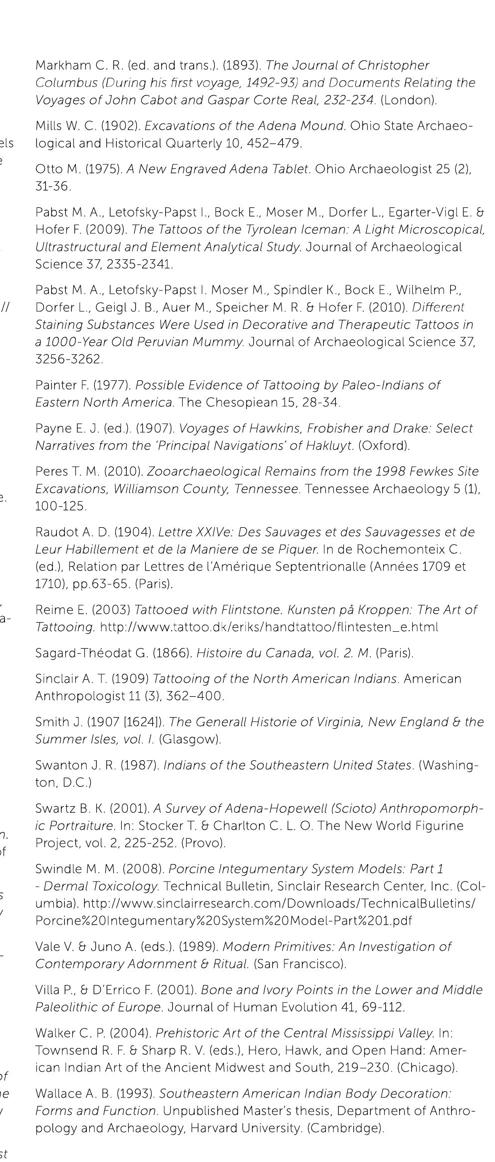 This chapter describes ongoing research into the archaeological remains of ancient tattooing in N... more This chapter describes ongoing research into the archaeological remains of ancient tattooing in North America’s Eastern Woodlands. Ethnohistorical sources are first examined to identify indigenous tattoo technologies. Those tools are then recreated and applied in an experimental test to determine which are best suited to the practice of tattooing. Finally, this research explores the utility of scanning electron microscopy and energy-dispersive X-ray spectroscopy in identifying tattoo implements from archaeological collections. While none of these techniques provide indisputable means of identifying ancient tattoo implements, together they provide a more robust understanding of ancient Native American tattooing practices.