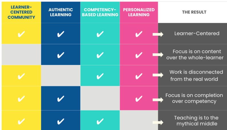 Central to this approach is creating learning experiences for learners of all ages to develop necessary skills, demonstrate competence at their pace, and work with others to engage in authentic work. At Learner-Centered Collaborative, we identified four aspects supported by the learning sciences that work together to create a learning model: authentic, personalized, competency-based, and learner-centered community.