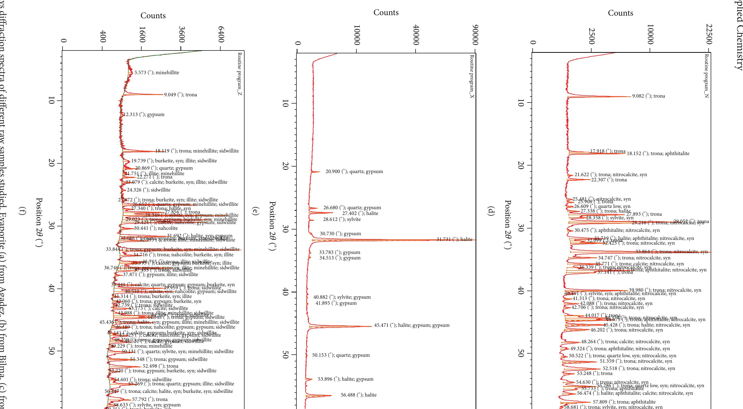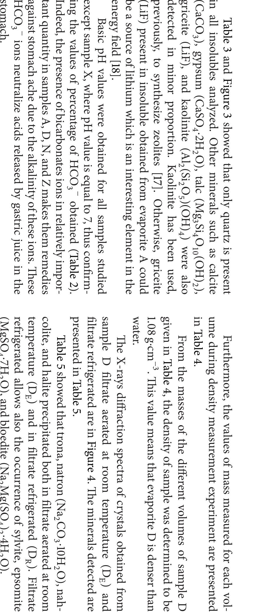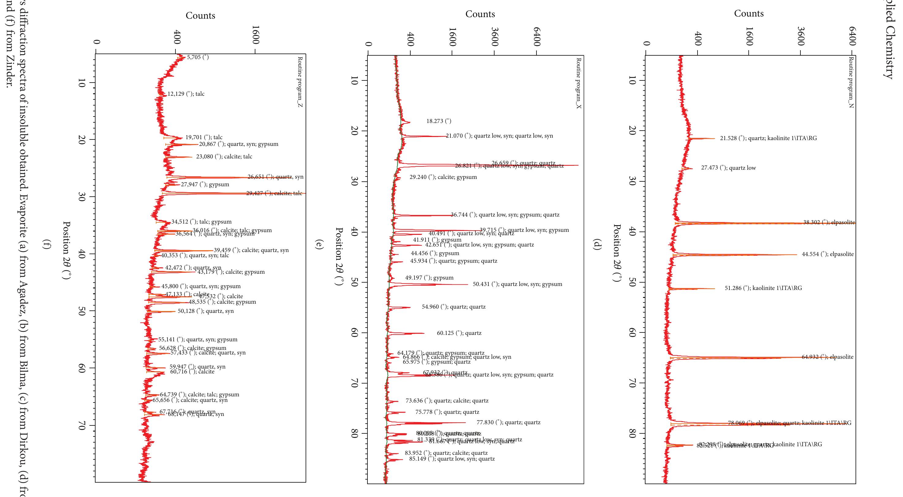 Some physicochemical (insoluble content, ionic composition, density, and X-ray diffraction spectr... more Some physicochemical (insoluble content, ionic composition, density, and X-ray diffraction spectra) characteristics of Nigerien evaporites were investigated in this study. The results obtained showed that trona is the main mineral contained in Agadez, Dirkou, Niamey, and Zinder evaporites while thenardite and halite constitute the major minerals in Bilma and Tabalak evaporites, respectively. In addition, all evaporites samples investigated revealed the presence of quartz and halite. Other interesting minerals (calcite, gypsum, sylvite, aphthitalite, nahcolite, illite, burkeite, kaolinite, griceite, and talc) were also detected. The use of Agadez, Dirkou, Niamey, and Zinder evaporites as catalyst to accelerate cowpea cooking is due to bicarbonates ions present in trona. Bilma and Tabalak evaporites employed in animal feeding are due to the halite contained in a significant quantity. Evaporites samples were taken in Agadez, Bilma, Dirkou, Niamey, Tabalak, and Zinder areas of Niger, Africa. Each sample is designated by the first letter, in capital, of the name of the locality, except Tabalak which is designated by X (see map in Figure ). Note that Tabalak does not appear in the map. It is located in the department of Abalak in the region of Tahoua. 2.1. Preliminary Analysis. X-rays diffraction spectra (using Phillips X'PERT PRO diffractometer model) of six raw