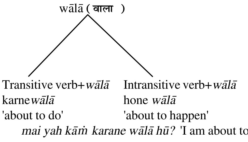 WAlA normally a nominative suffix in Hindi/Urdu, has a wide range of usage. As a nominative suffix, it appears to be synonymous with the possessive marker in most of the cases. Its use as a suffix with adjectives covers a wider range of meanings, mostly demonstrating intensity. However, its use with verbs gives it a different function (mostly syntactic) extending to the morpho-semantic levels. Its usage with verbs invites a deeper analysis and description. The paper attempts to bring in the usage of wAlA in expressions to evaluate its meaning and usage at morphological, lexical and semantic levels. It further attempts at investigating its usage at pragmatic level as well. Also a diagnostic test is evolved to determine its varied range of usage with the verbs clarifying some confusions appearing at that level.
